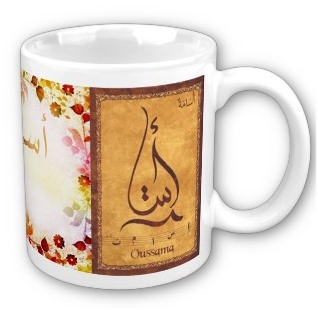 Mug avec le prénom "Oussama" calligraphié en arabe (اسامة) ainsi que son épellation lettre par lettre en arabe.