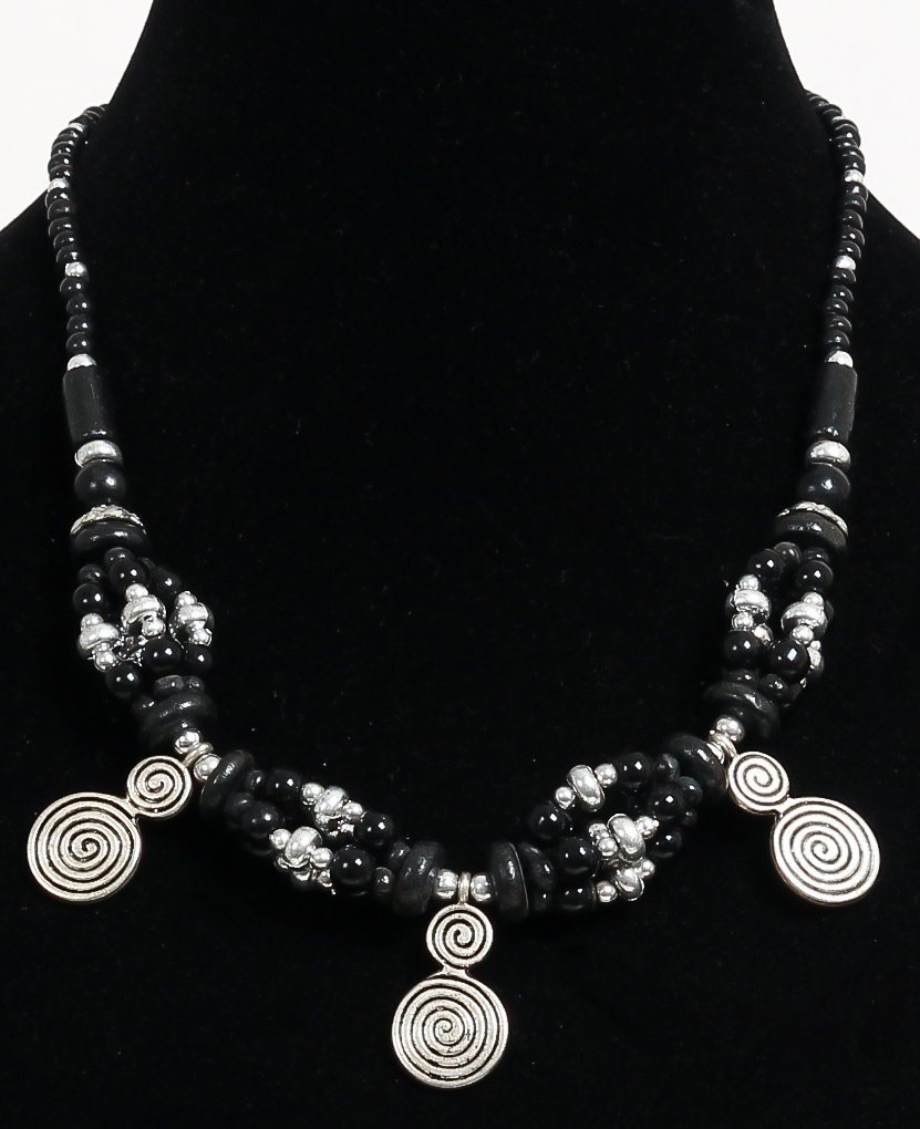 Collier ethnique artisanal perles noires agencees d'agrements argentes garni de grandes breloques spirales en metal argente