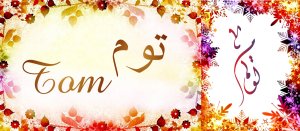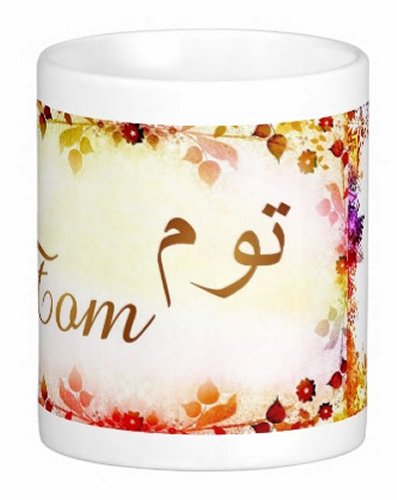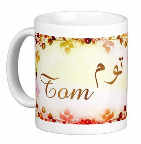 Mug avec le prénom "Tom" écrit en français, en arabe (توم) et calligraphié de façon artistique en arabe sur la partie droite.