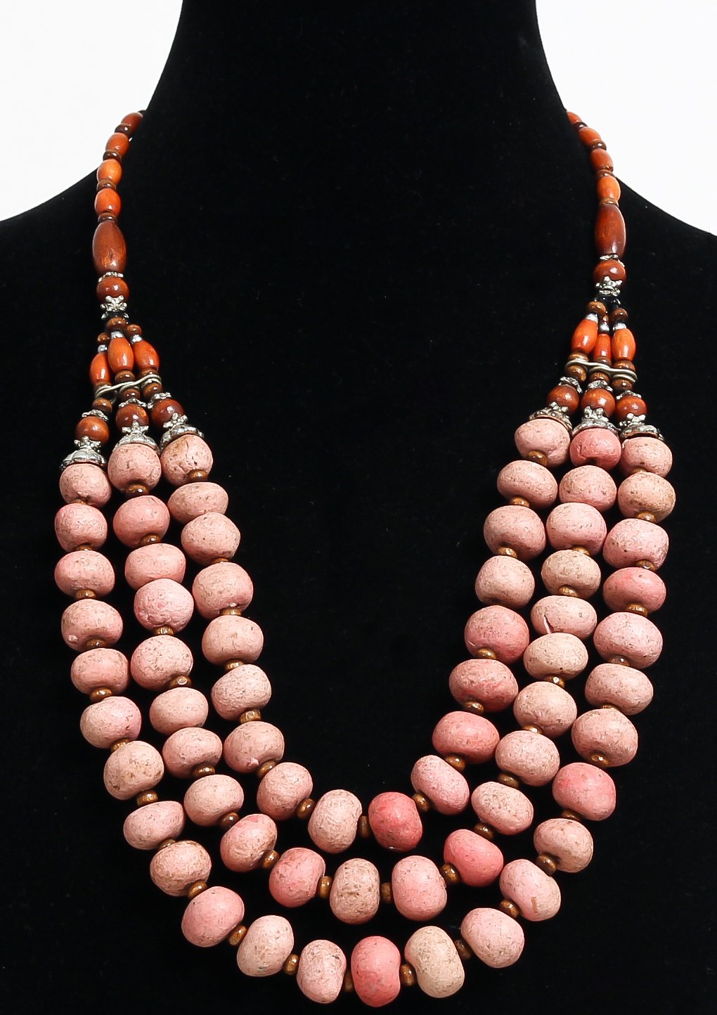Collier ethnique artisanal trois rangs imitation pierres rondes corail agencées d'armatures argentées et de perles en bois Vetement & Accessoire