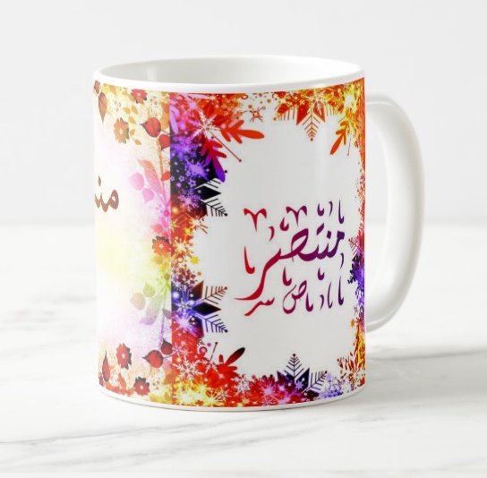 Mug avec le prénom mountassir calligraphié en arabe ainsi que son écriture normale en arabe (منتصر) et en français.