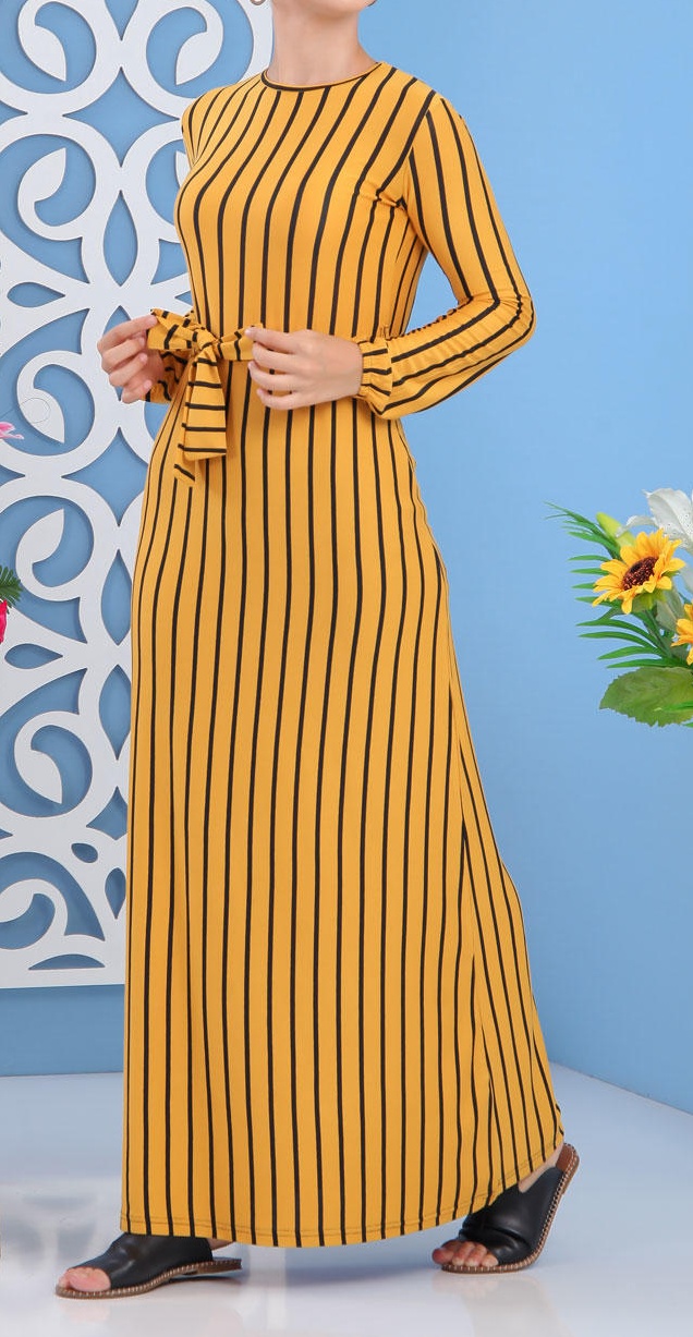 Robe à rayures, col rond, manches longues finition élastiques aux poignets le tout assorti d'une ceinture. Ce modèle sobre et élégant peut se mettre dans multiples occasions.
