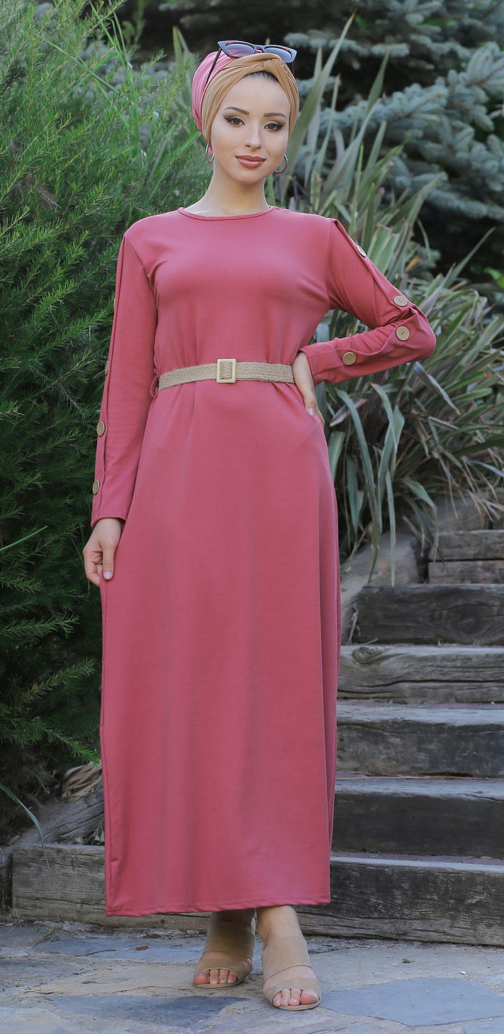 Robe longue, coupe droite, col rond, ceinture tissé à passants, manches avec décoration boutons, tissu effet crêpe. Ce modèle sobre et classique s'adapte pour diverses occasions et en toute saison.