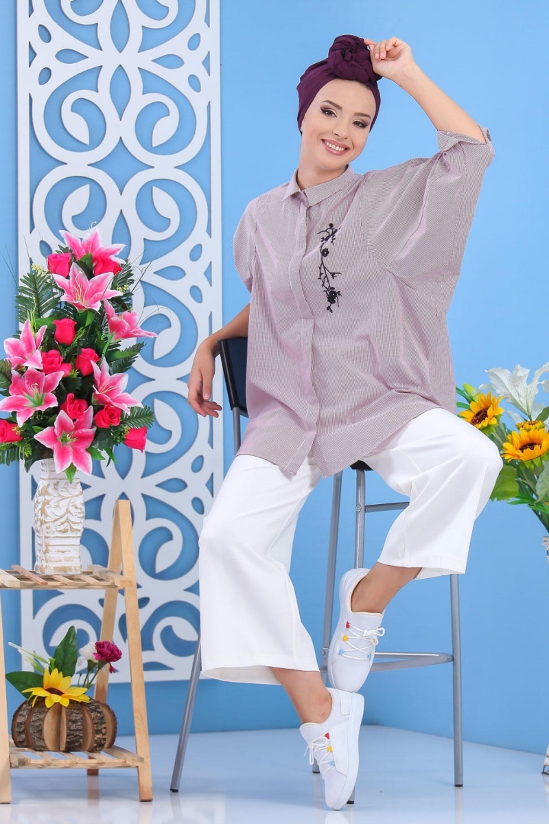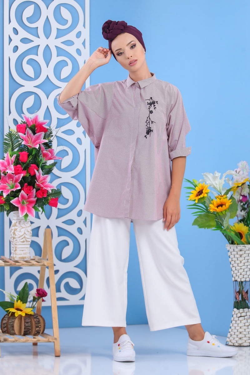 Chemise à broderies noires, manches papillons finition boutons aux poignets, coupe ample. Ce modèle reste un basique et indémodable qui se porte en toute saison et diverses occasions.
