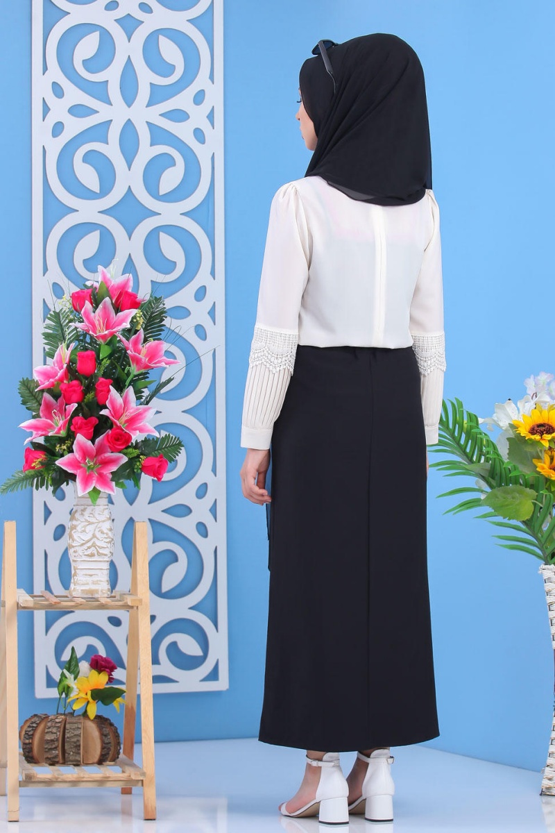 Ensemble Pantalon ample type Palazzo et Blouse avec collier assorti (Tenue Hijab casual pour femme voilée) - Couleur crème et vert amande - REF. 32872 (19.90 €)