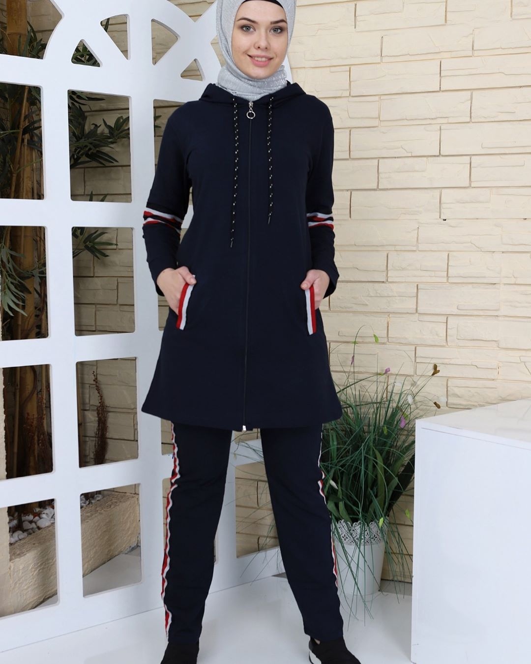 Survêtement 2 pièces. Veste : mi longue, capuche avec liens de serrage, fermeture zippée, 2 poches latérales, coupe droite, matière sweat. Pantalon : coupe droite, taille élastique.