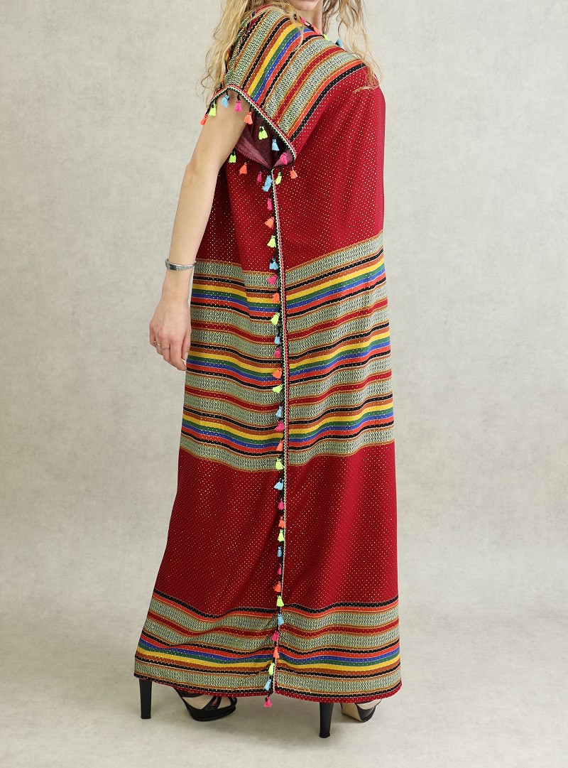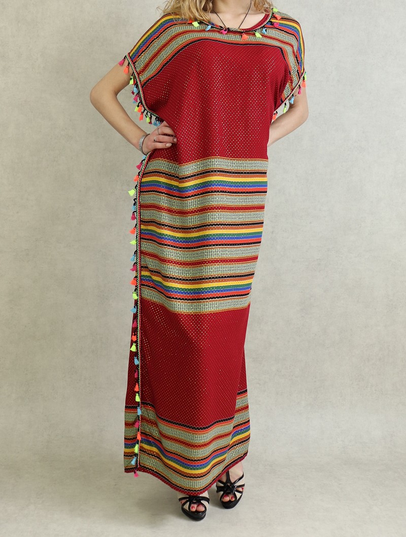 Robe orientale longue à rayures horizontales multicolores, mini-pompons sur toute la longueur et au niveau du col, paillettes brillantes sur toute la robe, coupe droite, col rond. On aime son tissu au toucher et un tombé fluide et confortable. Agréable robe d'été ou pour la maison.