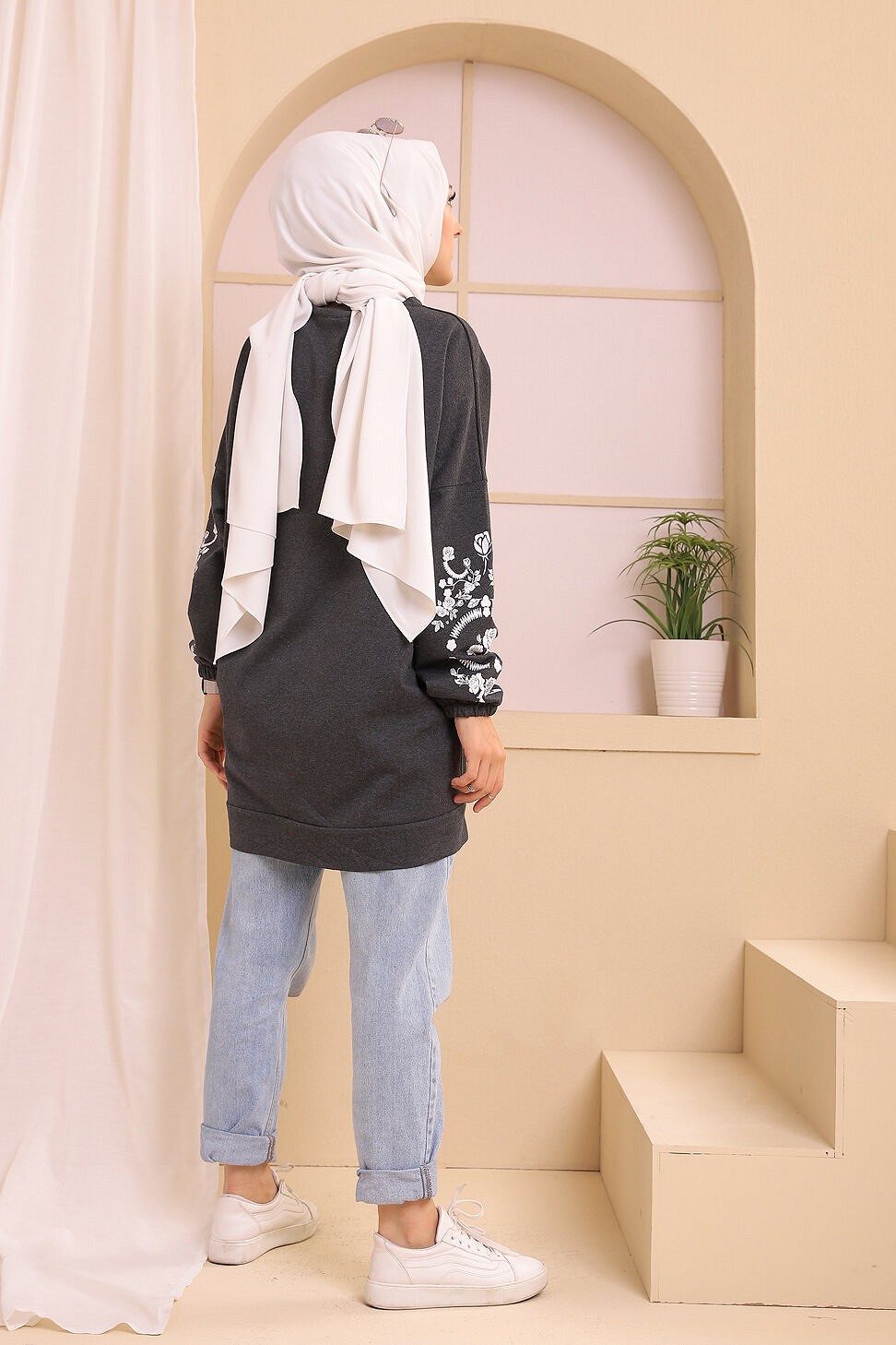 Tunique decontractee avec manches a motif fleurs (Tenue Hijab pour femme musulmane) - Couleur anthracite