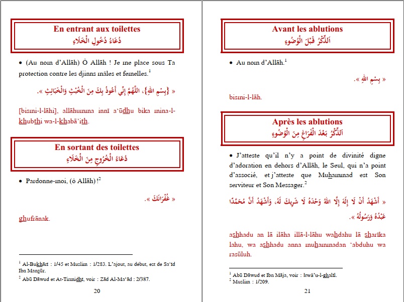 Ce livre est une compilation d'invocations (al-Du'â) issues du Coran et de la Sunna Prophétique. Edition bilingue avec la translittération phonétique des invocations pour faciliter leur apprentissage.