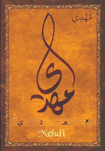 Jolie carte postale représentant le prénom arabe Mehdi calligraphié en arabe ainsi que son épellation lettre par lettre en arabe. Derrière la carte postale se trouve la signification du prénom. Prénom d'origine arabe signifiant guidé vers Allah.