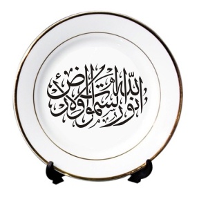 Assiette en porcelaine avec calligraphie artistique du verset coranique "Allah est la Lumière des cieux et de la terre" { الله نُورُ السَّمَـوَاتِ وَالأرْضِ } (Allahou Nourou-s-samâwâti wa l-ard) [Sourate An-Nour]. Ce verset signifie que Allah est Celui Qui guide les habitants des cieux et les habitants croyants de la terre vers la lumière de la foi. Allah n’est pas une lumière dans le sens qui est le contraire de l’obscurité car Il est Celui Qui crée la lumière.