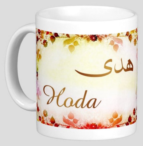 Mug avec le prénom "Hoda" écrit en français, en arabe (هدى) et calligraphié de façon artistique en arabe sur la partie droite.