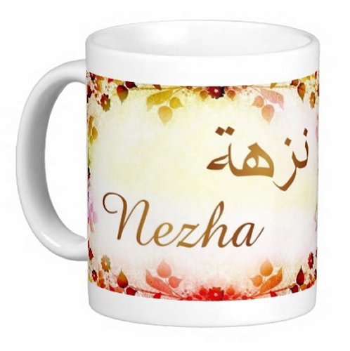 Mug avec le prénom "Nezha" écrit en français, en arabe (نزهة) et calligraphié de façon artistique en arabe sur la partie droite.