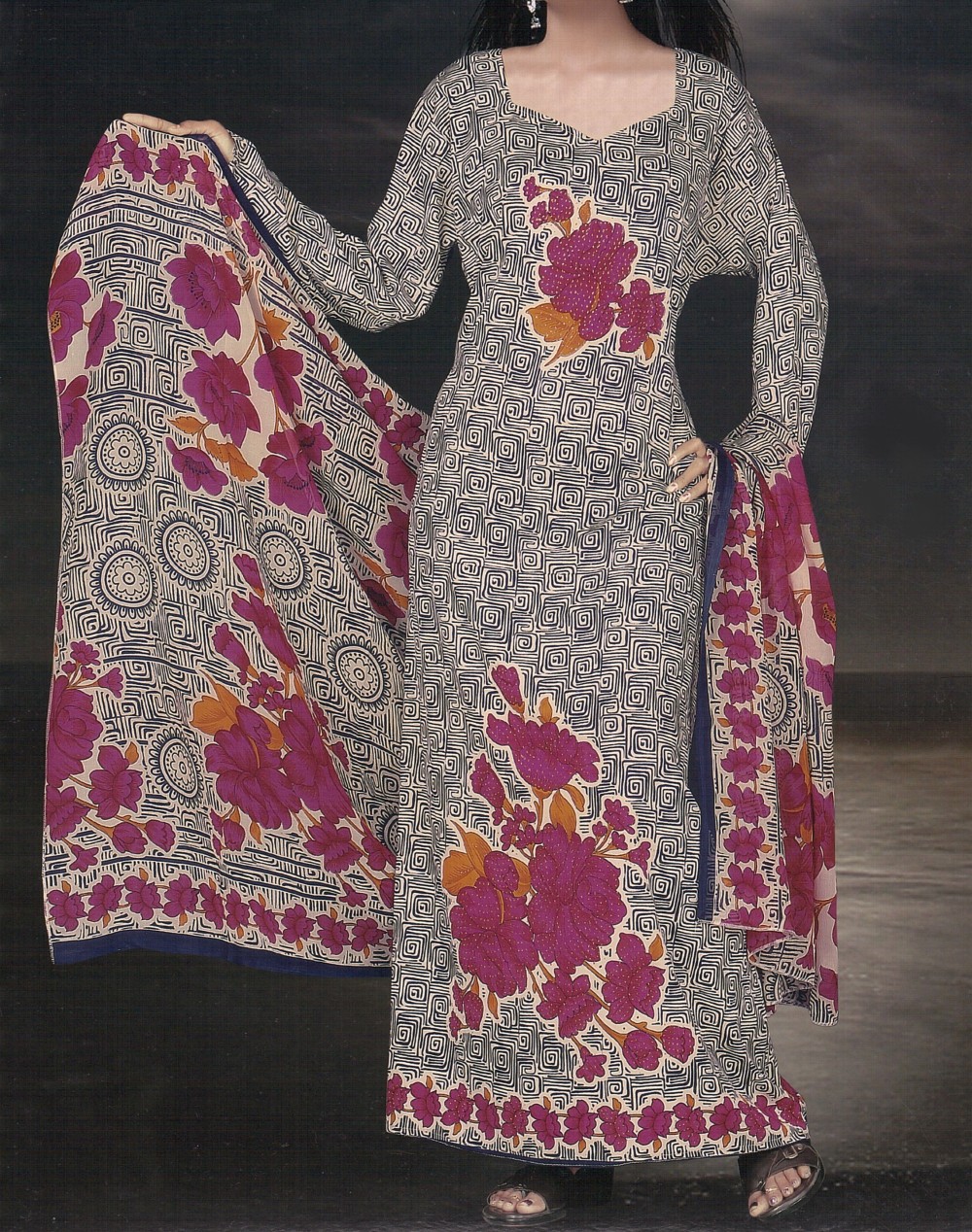 Robe orientale d'été avec motifs grandes fleurs violettes et un foulard assorti - REF. 20207 (24.90 €)