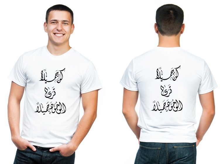 T-Shirt portant une très jolie calligraphie artistique du proverbe arabe "koun jamîlan tara-l-kawna jamîlan" كن جميلا ترى الوجود جميلا (Sois admirable et tu verras tout autour de toi merveilleux).