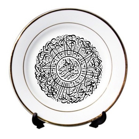 Assiette en porcelaine avec calligraphie artistique de Sourate Al-Kâfiroun qui contient six versets coraniques. Calligraphie réalisées par un calligraphe professionnel. Cette assiette se mariera bien avec tous types de mobilier.