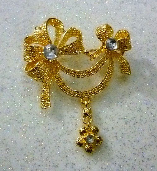 Broche pour Hijab dorée en forme de noeud, agrémentée de pierres diamantées et d'une fleur dorée suspendue.