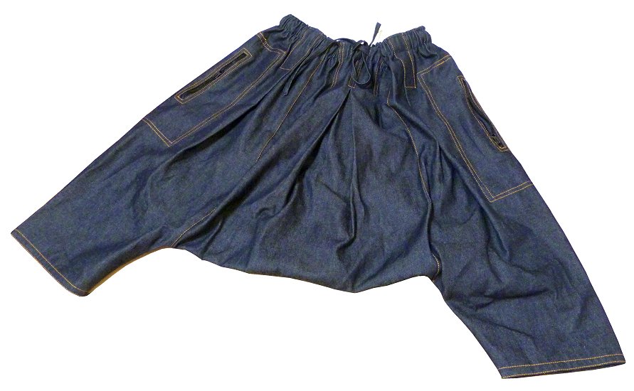 Sarouel pantalon jeans (Blue Jean) avec ceinture élastique avec cordon. Deux grandes poches latérales à fermeture zip.