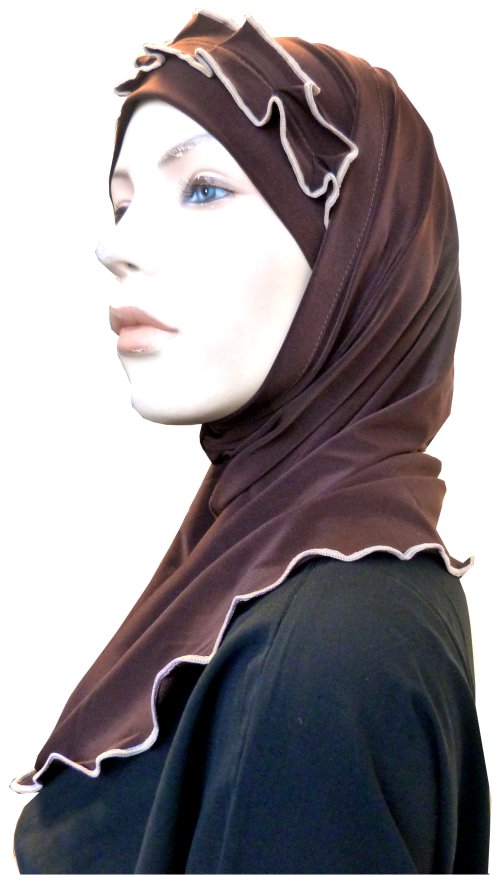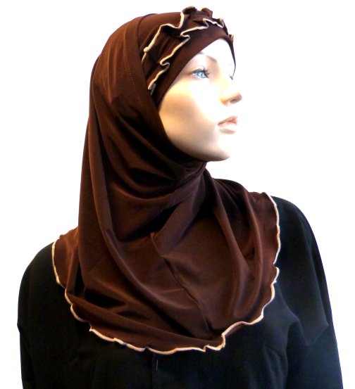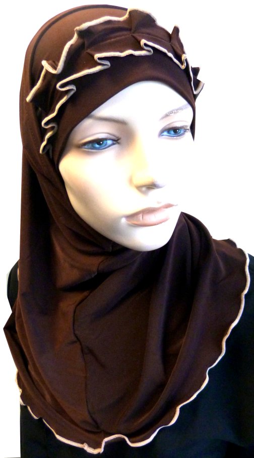 Très beau hijab 2 pièces marron chocolat avec ruban froncé piqué taupe.