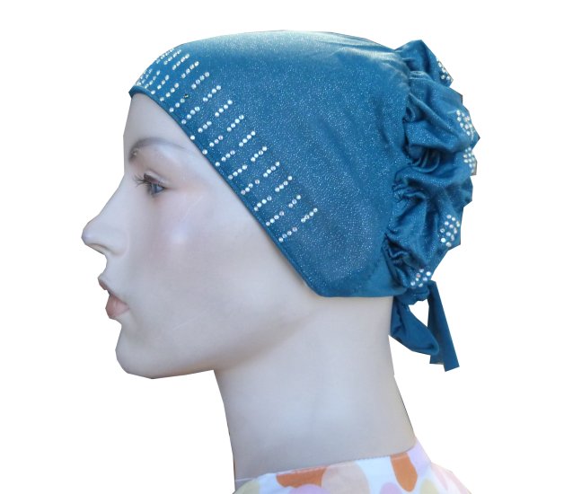 Bonnet bleu Prusse pailleté avec strass sur le devant ainsi que sur la coiffe.