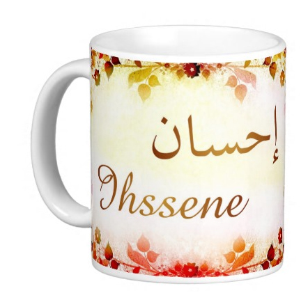 Mug avec le prénom "Ihssene" écrit en français, en arabe (إحسان) et calligraphié de façon artistique en arabe sur la partie droite.