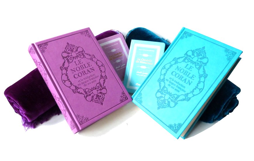 • Deux livres : Le Noble Coran et la traduction en langue française de ses sens (bilingue français/arabe) - Edition de luxe couverture cartonnée en cuir (un bleu et un mauve).