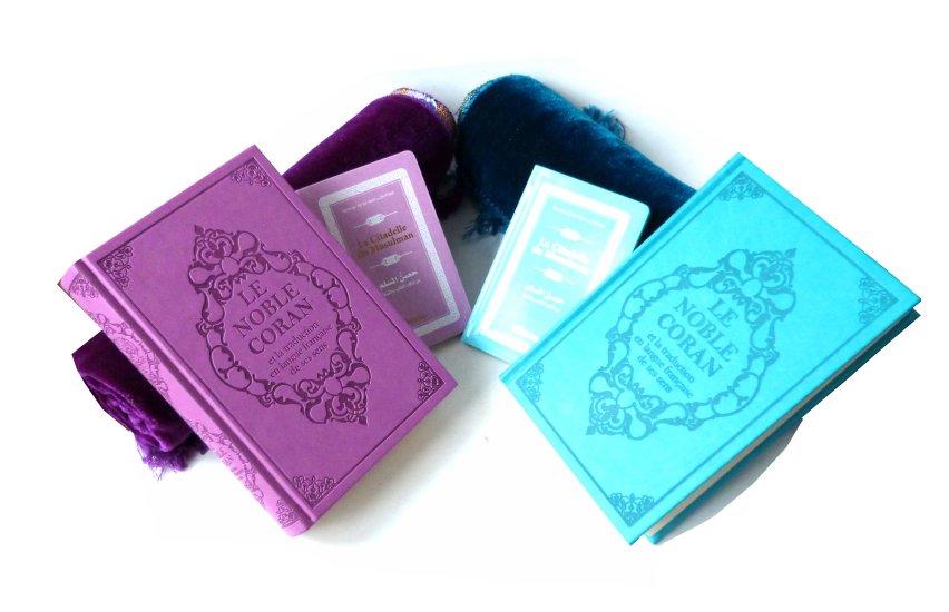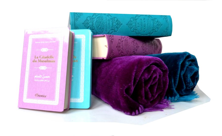 Pack cadeau mauve (mixte) : Le Noble Coran (bilingue français/arabe) + La Citadelle du Musulman + Porte Coran + Tapis de prière en velours + Parfum Musc d'Or Luxe (au choix) - REF. 23292 (49.00 €)
