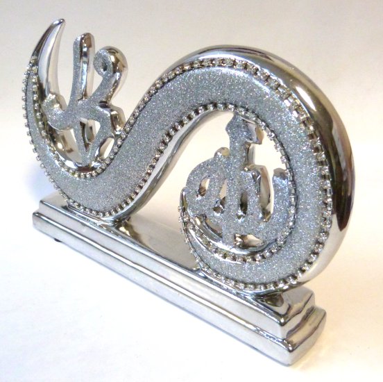 Objet décoratif en porcelaine argentée avec calligraphies Allah et Muhammad (SAW) décoré de diamants blancs.