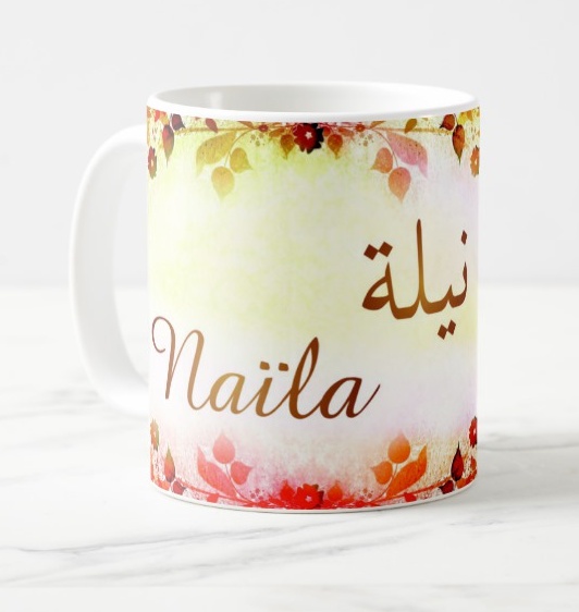 Mug avec le prénom Naïla calligraphié en arabe ainsi que son écriture normale en arabe (نيلة) et en français.