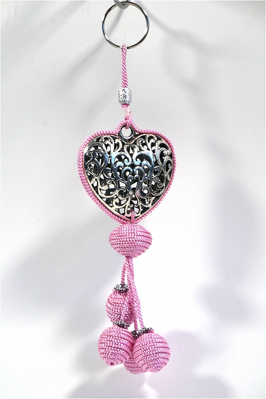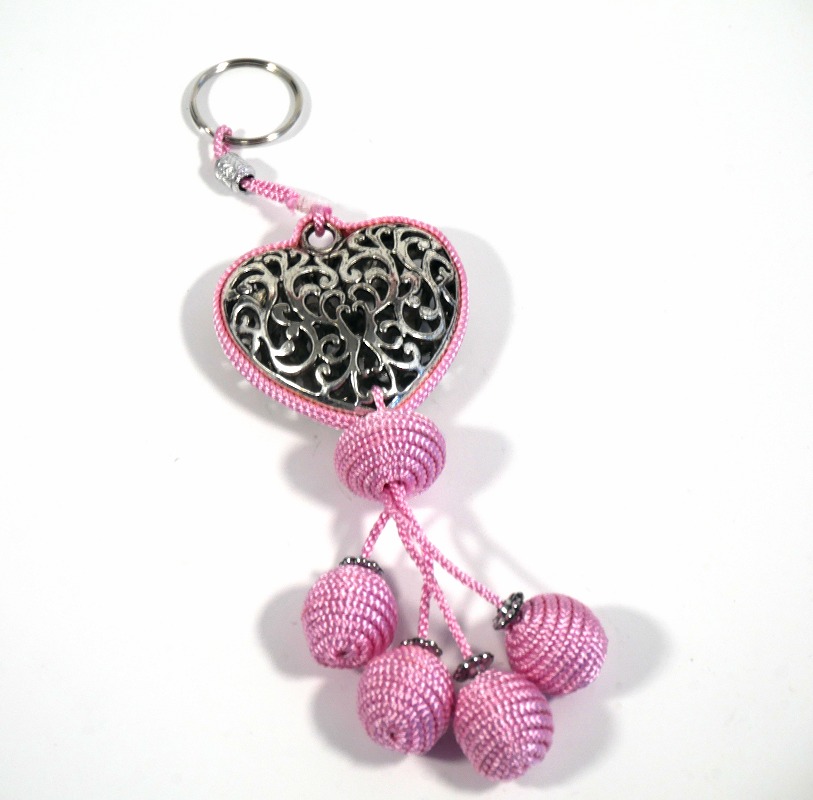 Pendentif décoratif / porte-clés avec cœur en métal argenté et pompons en sabra. De couleur rose pâle, il représente la solution idoine et la plus esthétique pour conserver vos clés.