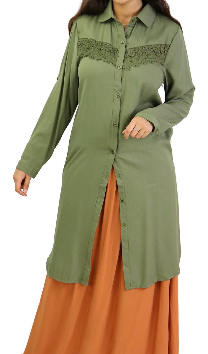 Chemise longue avec petites dentelles sur le devant. Les manches sont retroussables se replie grâce à une patte de boutonnage cousue à l’intérieur des manches, vous pouvez les retrousser en un clin d’œil et transformer ainsi votre chemise à manches longues en chemise à manches courtes.