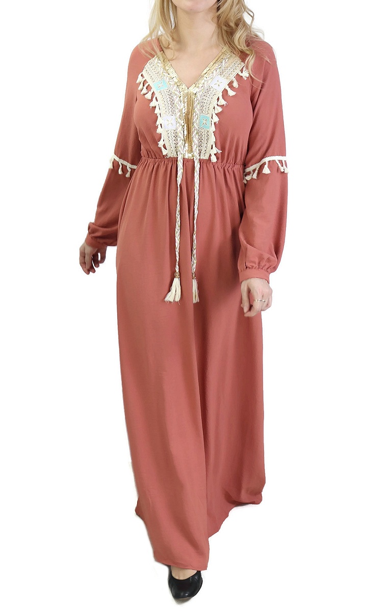 Belle robe longue pour toute occasion, col en V, tissu fluide et opaque, broderies originales et variées, manches longues finition poignets boutonnés.