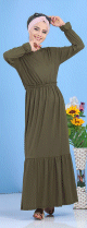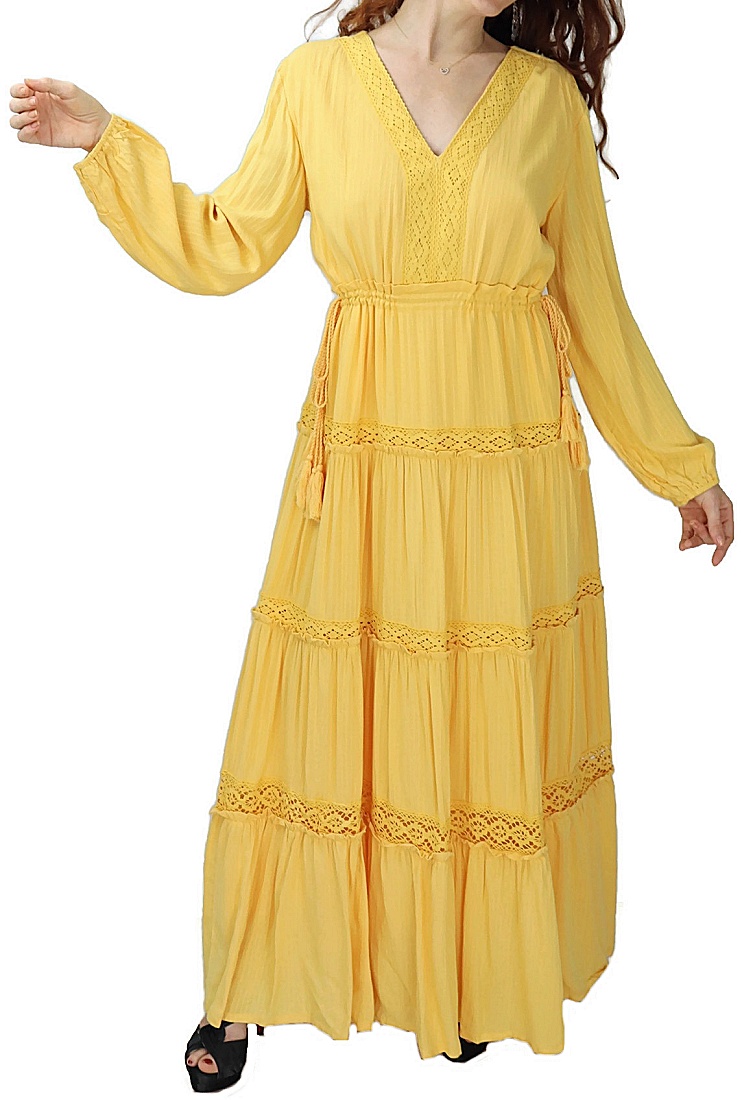 Robe longue bohème chic entièrement doublée (sauf aux manches), col en V brodé ainsi que sur différentes parties, cordons des serrage à la taille, 3 volants dentelles coton.