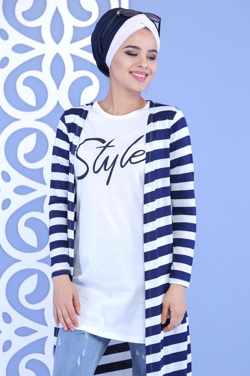 Ensemble 2 pièces tee shirt + gilet de couleur blanche à rayures bleues marines (tenue femme décontractée et moderne) Vetement & Accessoire