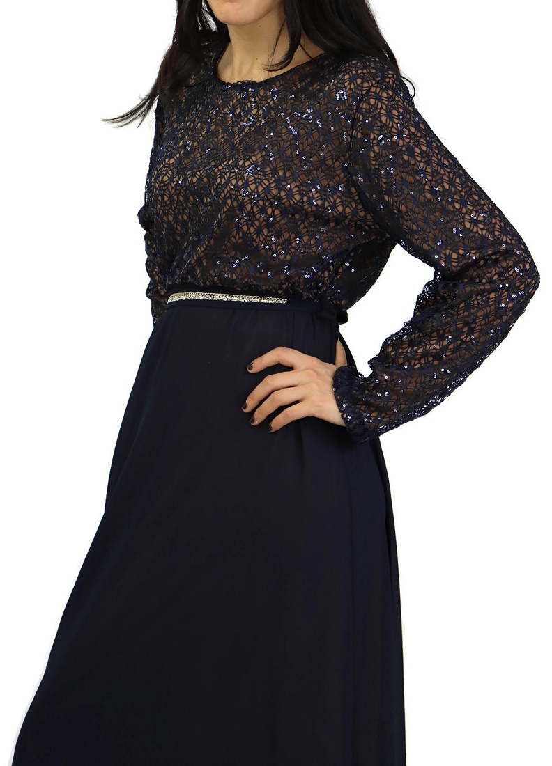 Robe longue évasée de couleur Bleu Marine, pailletée sur la partie haute? entièrement doublée (de couleur marron). La partie basse est faite en mousseline. Livrée avec sa ceinture assortie décorée de strass argentés et de chaines dorées.