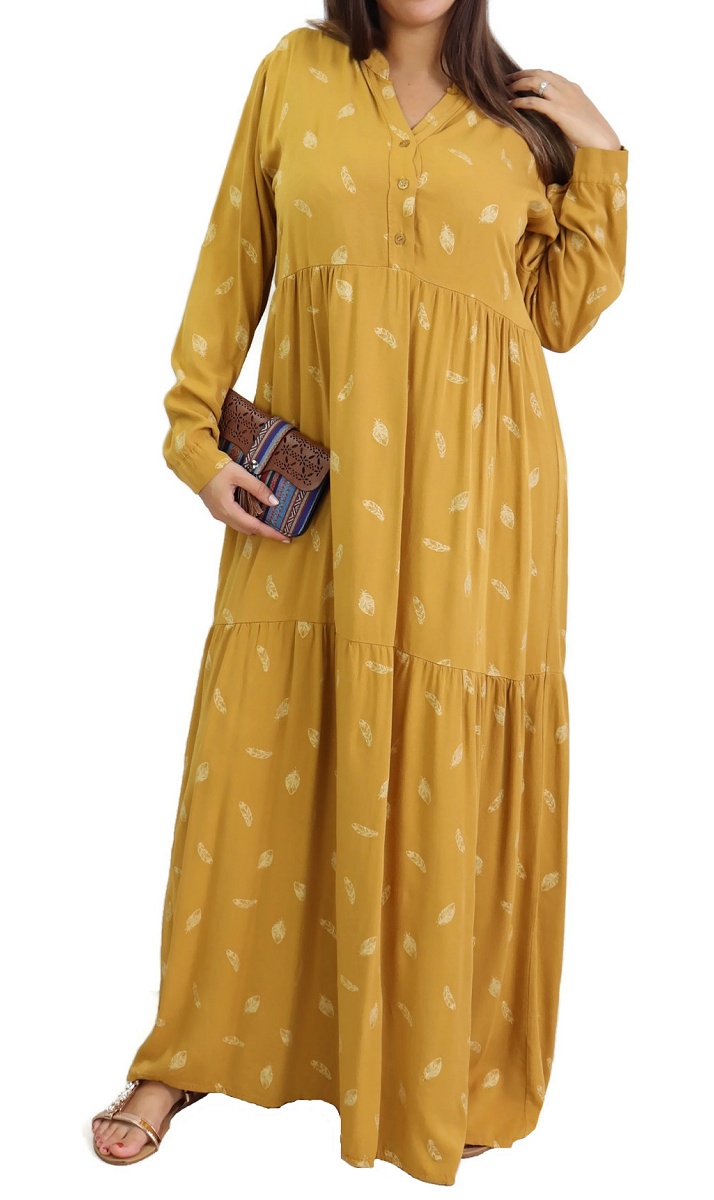 Robe tendance à motifs plume, manches longues, col Mao entre ouvert finition boutons. Coupe évasée légèrement cintrée à la taille et un effet volant à mi longueur.