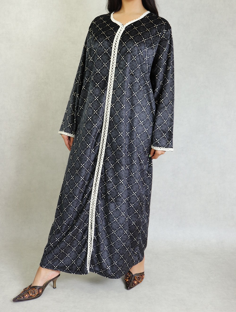 Robe arabe longue en velours à motif avec broderie blanche pour femme - Couleur Noir Vetement & Accessoire