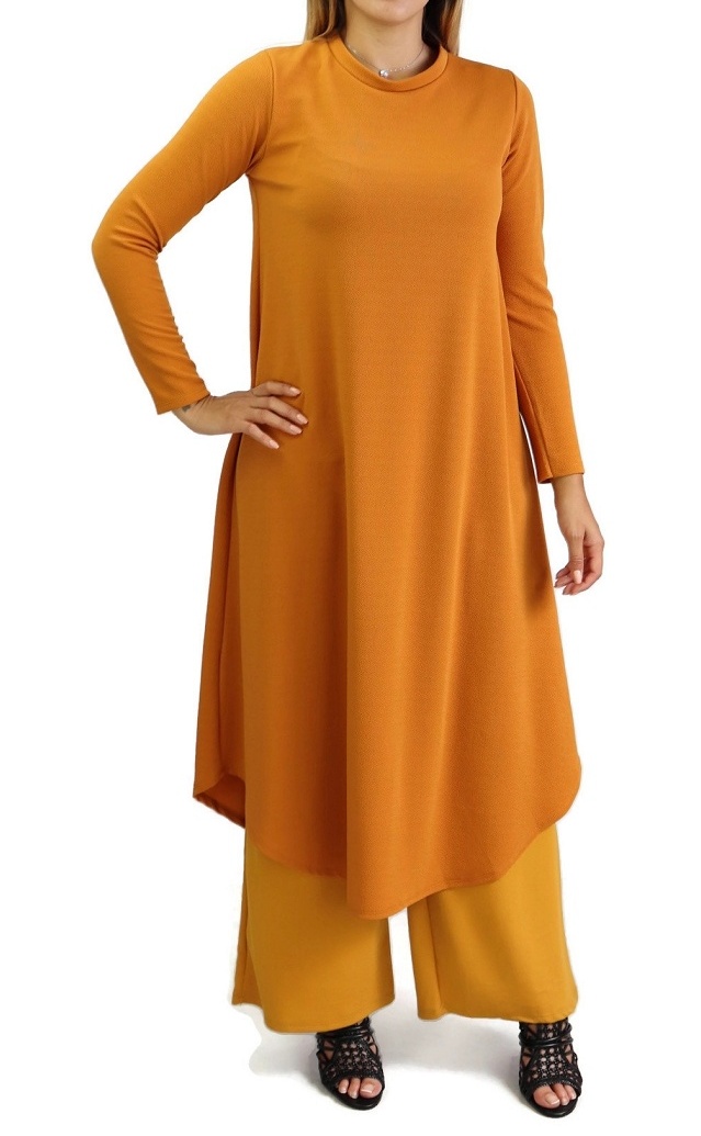 Un magnifique ensemble tunique et pantalon, col rond, le pantalon avec poches et élastique à la taille. Tissu épais et élastique non transparent.
