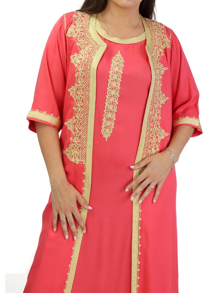 Gandoura marocaine (ensemble deux pièces robe et kimono) avec broderies dorées - Couleur rose saumoné Vetement & Accessoire