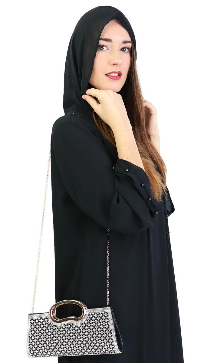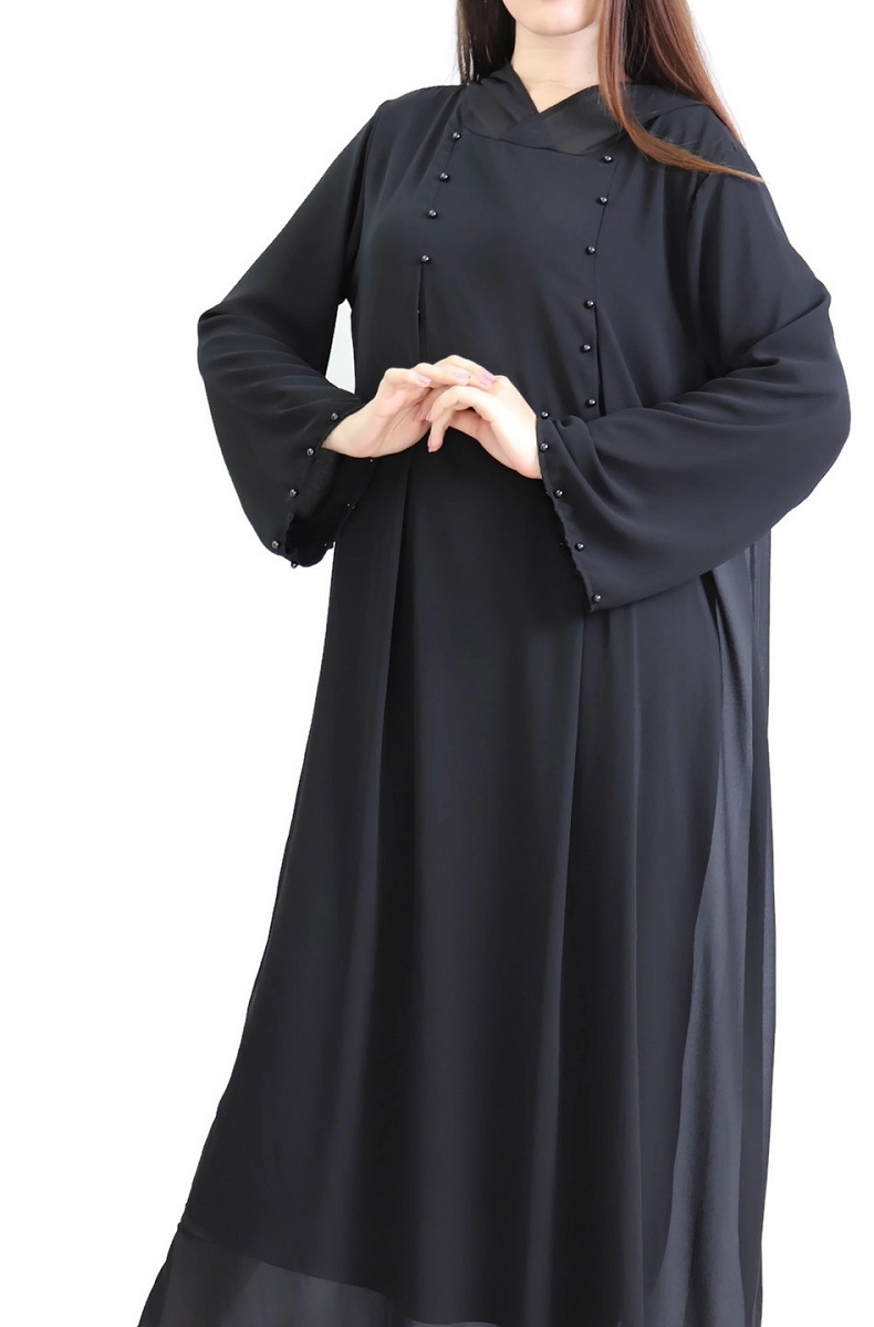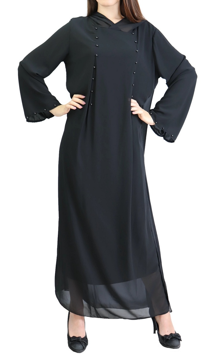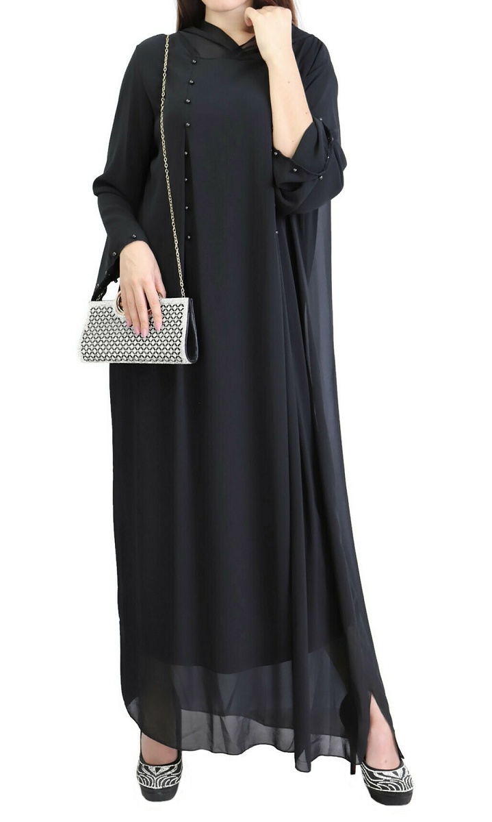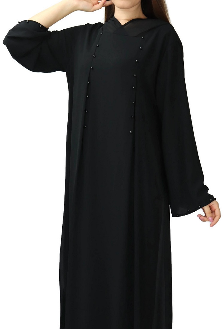 Robe longue, col capuche, entièrement doublée, manches longues, orné des perles sur le devant ainsi que les poignets. Sobre et élégant, Cette tenue s’accommode pour diverses occasions aussi bien festives que quotidiennes.