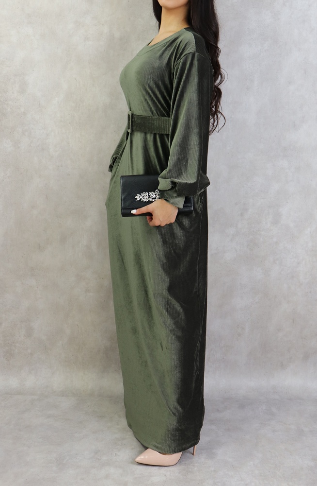 Robe longue, col dégagé, ceinture assortie ajustable, poches latérales, tissu épais et doux, effet velours côtelé, coupe droite.