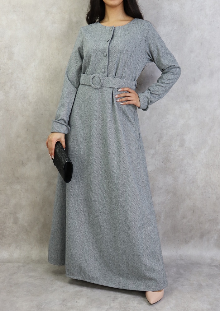 Robe longue, col rond, fermeture boutons sur le devant, manches finition revers, taille cintrée, ceinture réglable assortie à passants, tissu doux et épais, effet lainage, coupe évasée vers le bas.