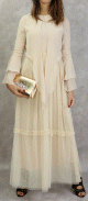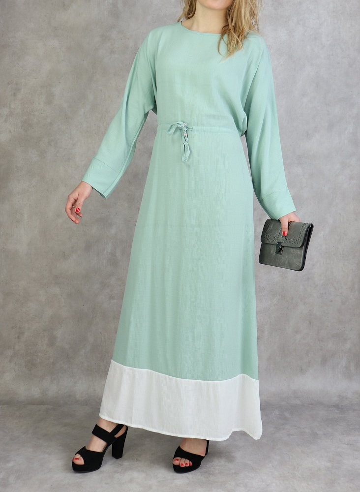Robe longue, col rond, manches amples, lien de serrage à la taille. Coupe légèrement évasée, tissu léger, effet crêpe.