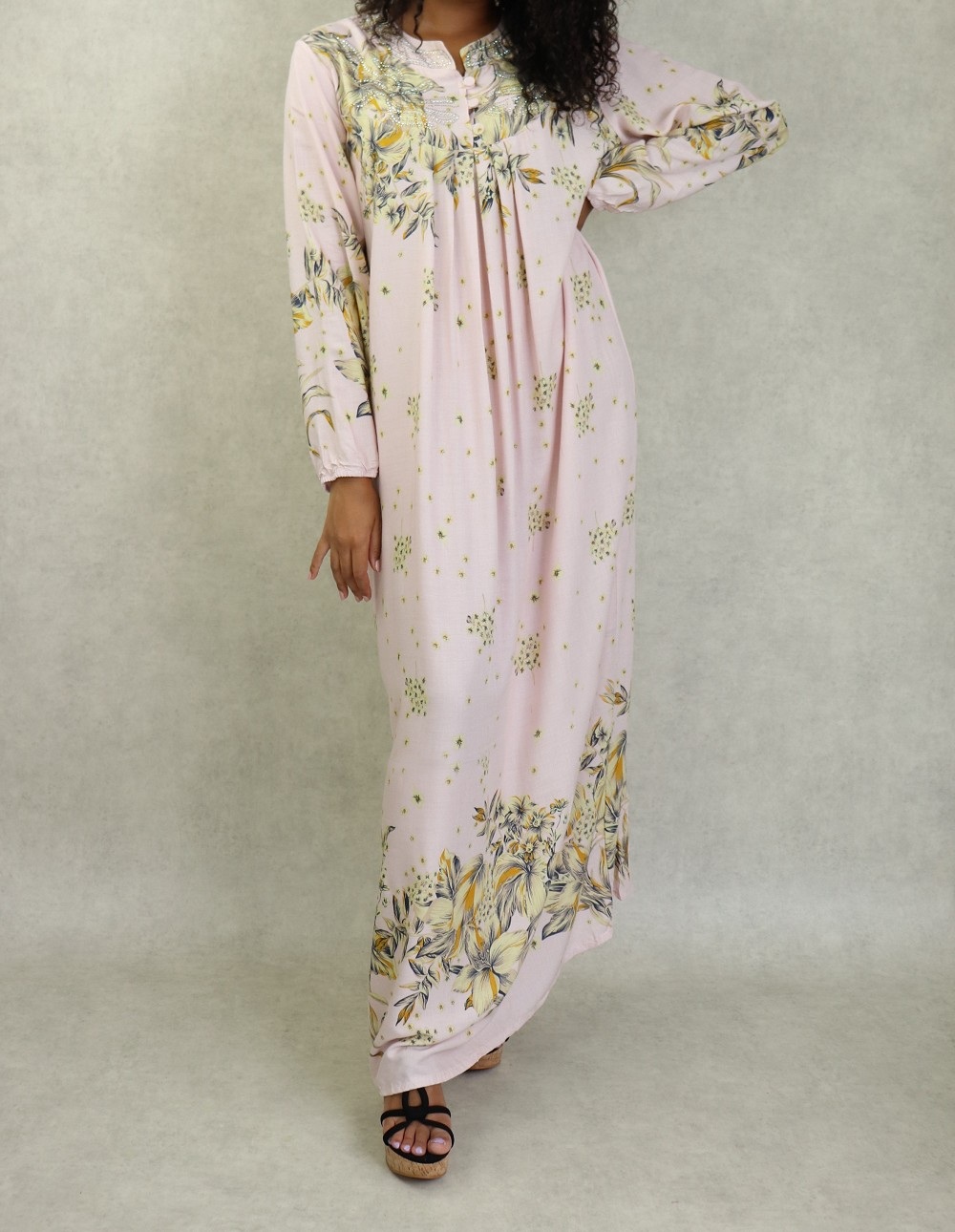 Robe d’intérieur avec motifs à fleurs sur fond rose poudrée. Col rond avec quelques strass et trois boutons décoratifs sur l'avant, manches longues finition élastiques aux poignets, matière douce et agréable.