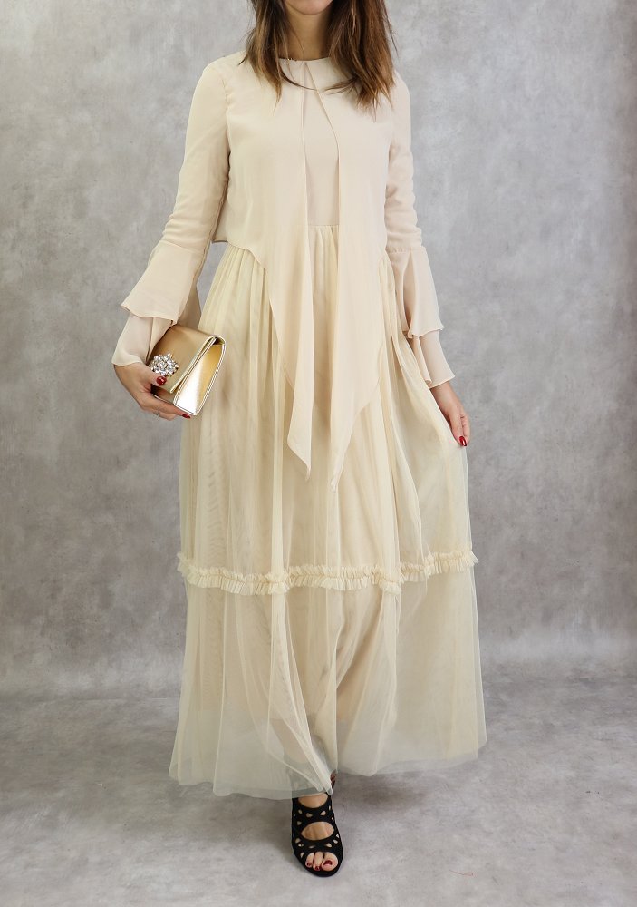 Robe longue, col rond, fermeture à glissière au dos, manches longues finition froufrous, effet boléro sur le buste, taille cintrée. Coupe évasée, tulle sur la moitié de la robe, entièrement doublée.