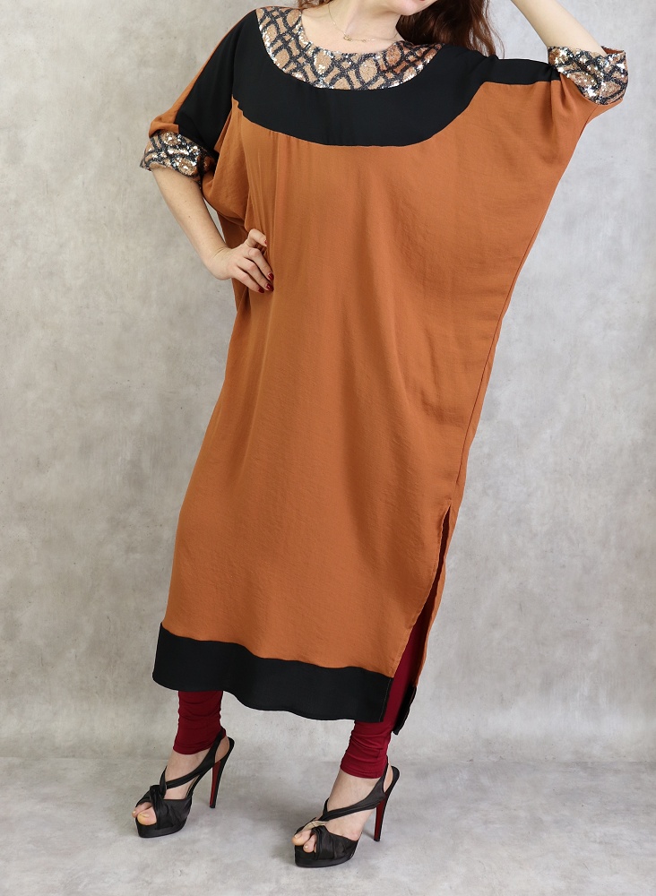Tunique longue effet papillon a strass de couleur rouille et noire