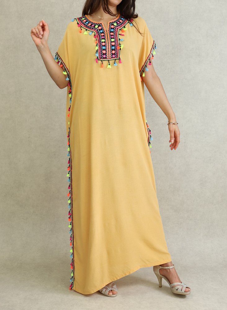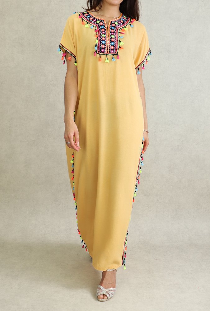 Robe orientale d'ete avec pompons multicolores - Couleur Jaune