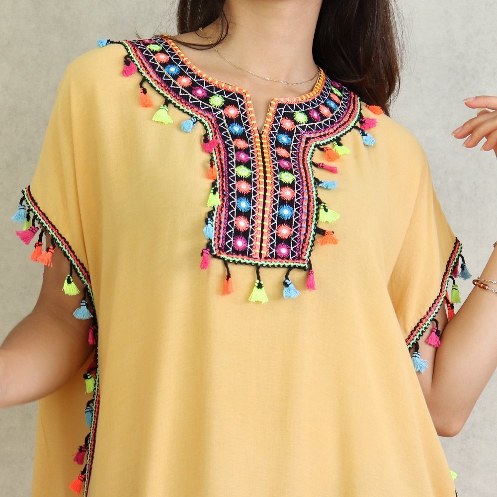 Robe orientale avec broderies et pompons, coupe droite, col rond semi ouvert, sans manches. La coupe ainsi que sa matière faciliteront une décontraction évidente.