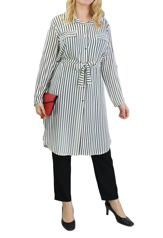 Chemise longue, manches ajustables, fermeture boutons, deux fausses poches plaquées, ceinture assortie, tissu effet crêpe, coupe droite.