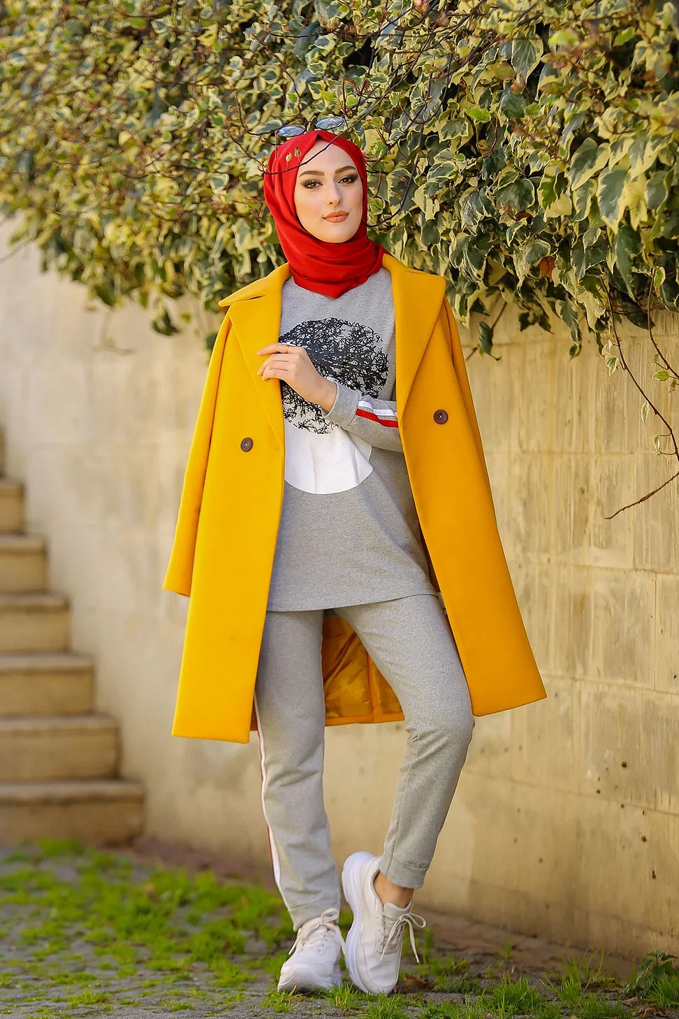 Survêtement hijab sport chic à capuche pour femme musulmane (deux pièces haut et bas) - Couleur noir et moutarde - REF. 33888 (25.00 €)